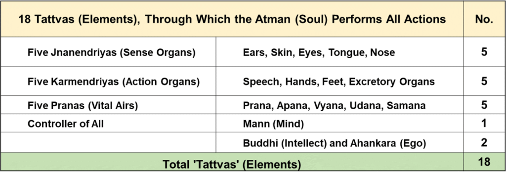 • Good and bad deeds are known as virtue (puṇya) and sin (pāpa). All human actions are performed through these 18 elements.
