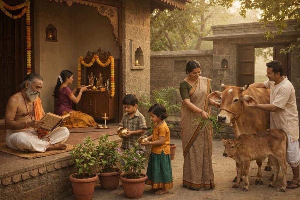 “One who has faith in the systems of Varnas and Ashramas, is a protector of the cow, believes in rebirth and strives for liberation from it, and who always conducts himself with kindness toward all living beings, is considered a Hindu. His heart is pained by violence; therefore, he is called a Hindu.”