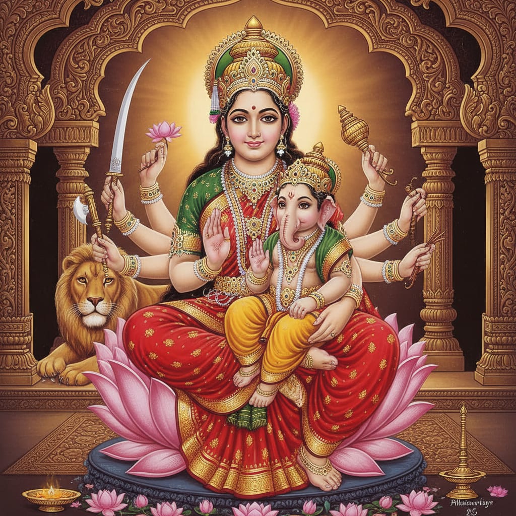 Among the supreme 5 Godesses, the foremost is Bhagavati Durga, the Mother of Ganesha, who is also known as Shivaroopa. She is the beloved consort of Lord Bhava (Shiva), the sustainer of all beings.