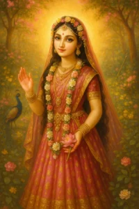 Residing in Golok Dhama, she is especially renowned as Raseshwari and Surasika. She loves to remain present in the Rasa Mandala, where she appears in the form of a Gopi. She is the embodiment of supreme bliss, her very body radiating joy and contentment. She is nirguna, nirākāra, nirlipta, and fully one with her own self (Atmasvarupini). Free from desire and ego, she has taken this incarnation solely out of compassion for her devotees.