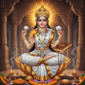 “O Narada, listen with attention! She who is supremely pure and the very embodiment of Sattva (the principle of purity and harmony) is known as Bhagavati Lakshmi. She is the power (śakti) of the Supreme Lord Shri Hari. All the wealth and treasures of the world are but her manifestations. Therefore she is worshipped as the Adhiṣṭhātrī Devatā (the presiding deity) of prosperity.